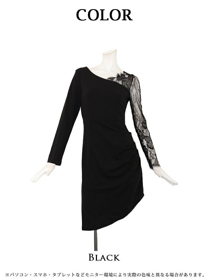 透け感レースで魅せる、大人エレガントな一着 アシンメトリーレーススリーブ膝丈キャバドレス 加賀美早紀 着用 キャバドレス【Belsia】(S/M/L/XL(2L))(ブラック)