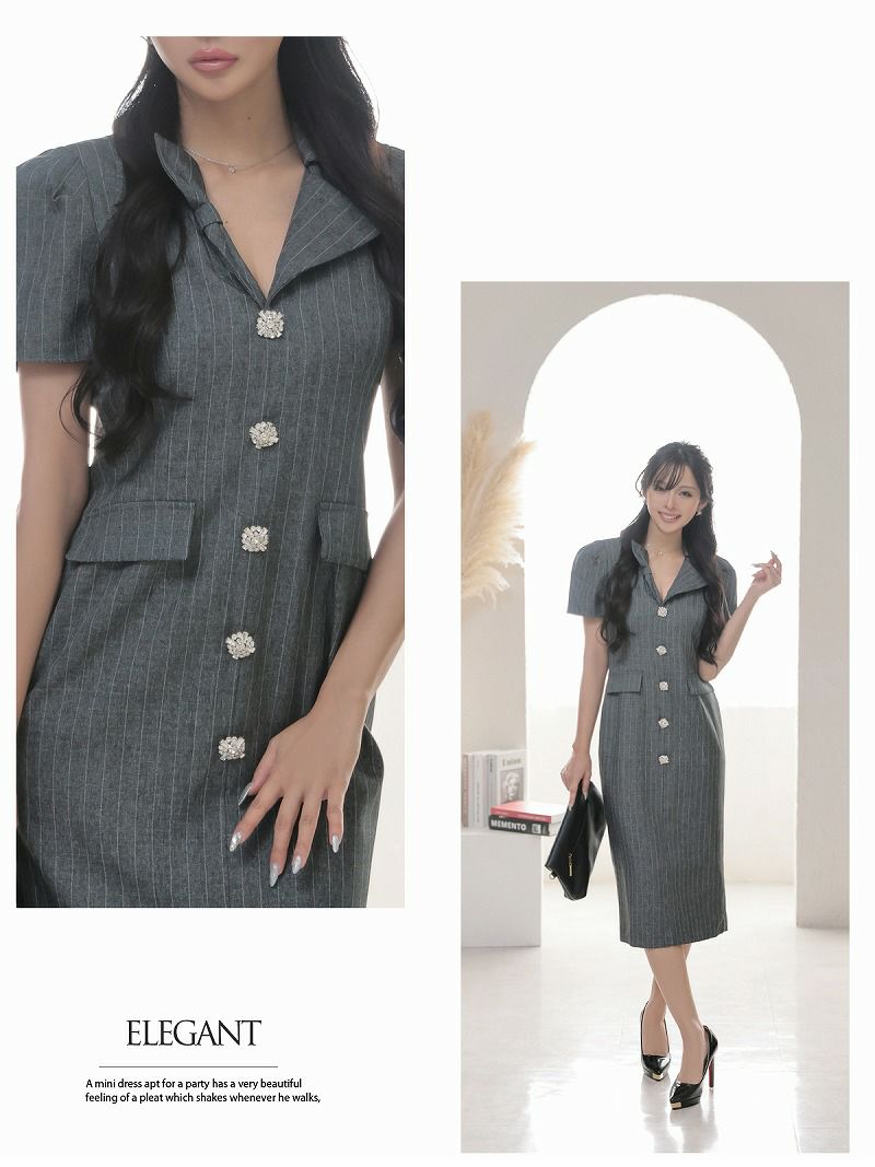6. ストライプタイト襟付き膝丈韓国ワンピース KANO 着用 キャバワンピース【DAYS PIECE】(S/M/L/XL(2L)/XXL(3L))(グレー)