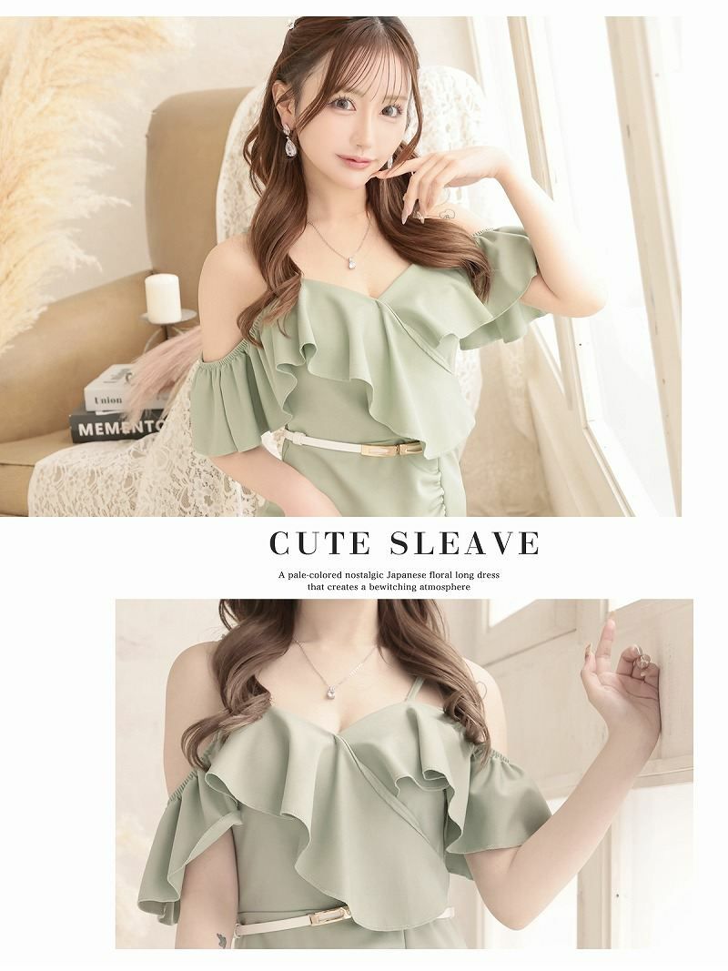 胸元の大きめフリルで谷間みせを叶えつつ、華やかなボリューム感で小顔効果も狙えるドレスです。