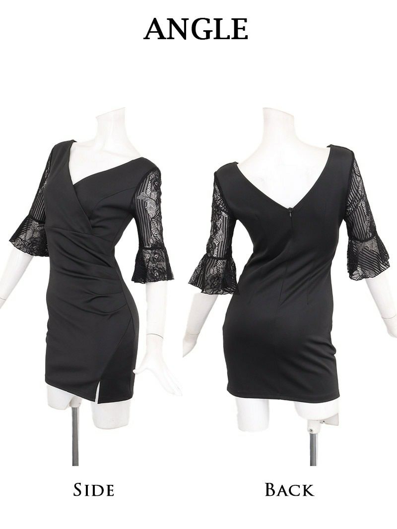 ベルスリーブ袖レースカシュクールタイトミニドレス ギャザー寄せウエスト細見せキャバドレス 前スリット入り りせり 着用 キャバドレス【RyuyuChick】