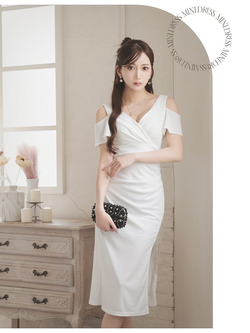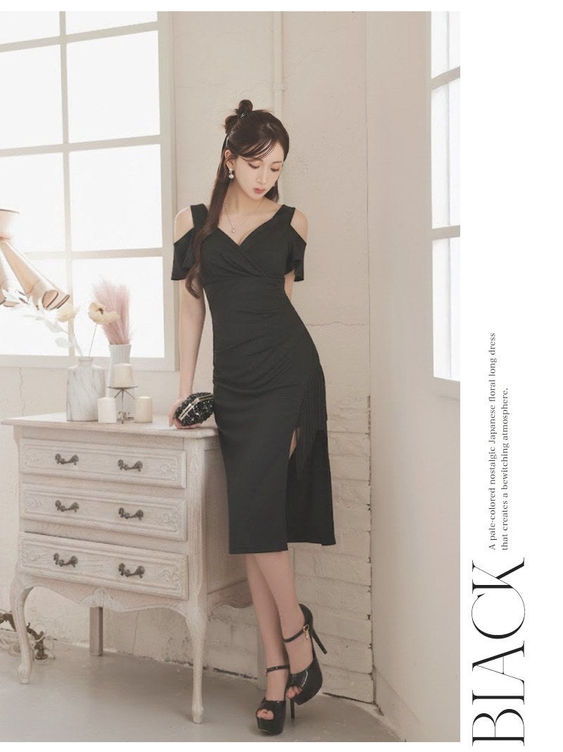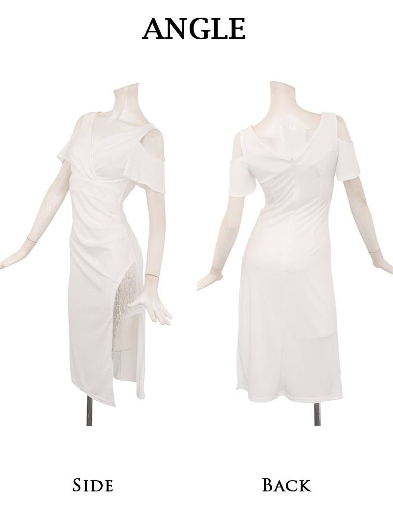 ビジューフリンジ付きのカシュクールデザインが大人っぽいカットショルダー膝丈ストレッチドレス 【Ryuyu】