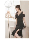 7. ビジューフリンジ付きのカシュクールデザインが大人っぽいカットショルダー膝丈ストレッチドレス 【Ryuyu】(S/M/L/XL(2L))(ブラック/ホワイト)