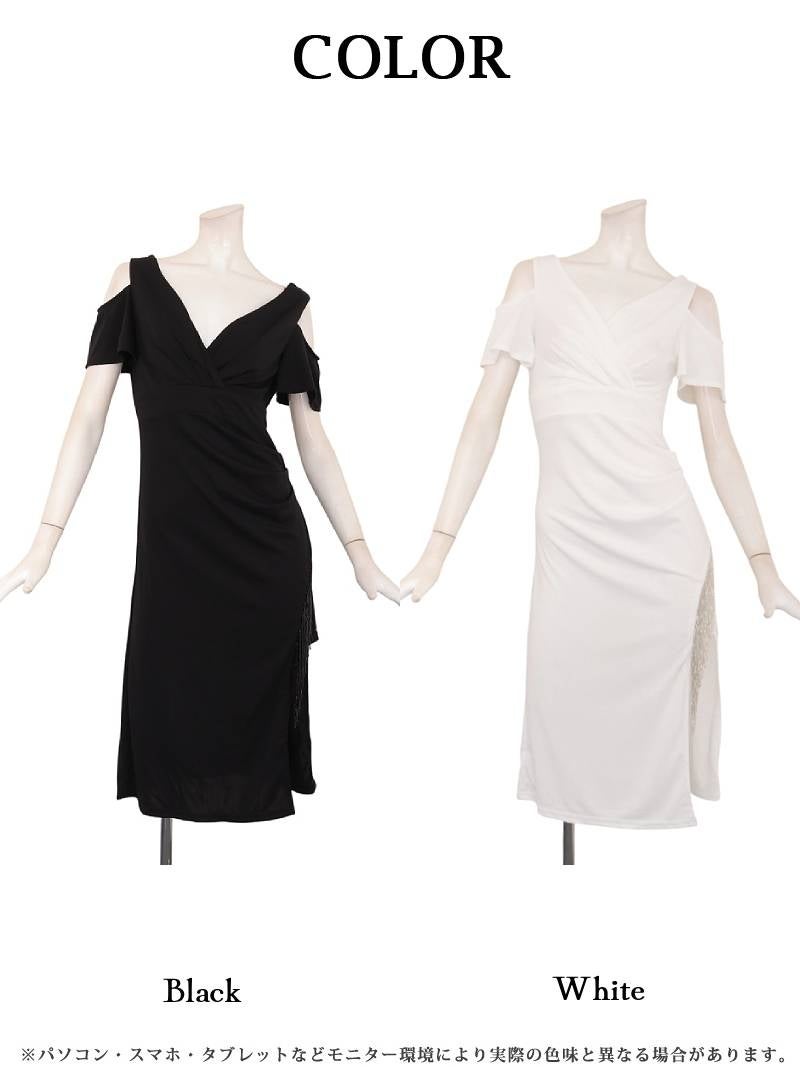 5. ビジューフリンジ付きのカシュクールデザインが大人っぽいカットショルダー膝丈ストレッチドレス 【Ryuyu】(S/M/L/XL(2L))(ブラック/ホワイト)