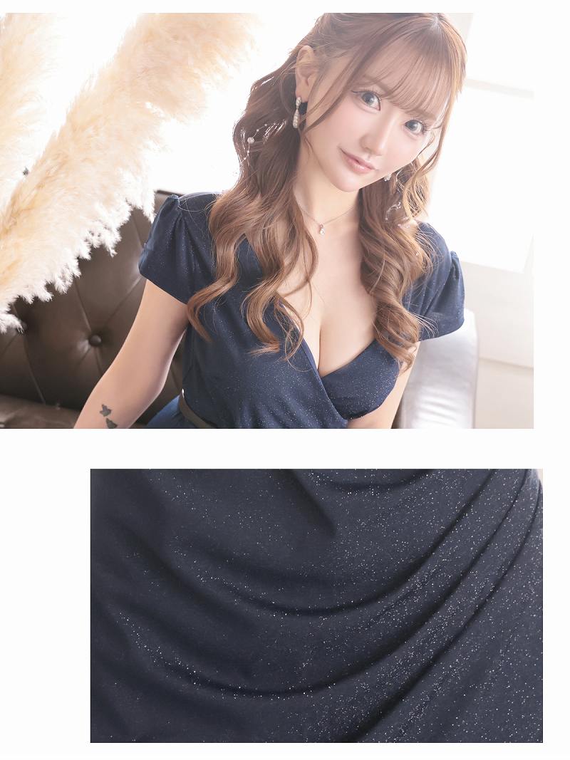 きらきらラメ入り素材のストレッチが効いたカシュクール風袖付きタイトミニドレス りせり 着用 キャバドレス【RyuyuChick】