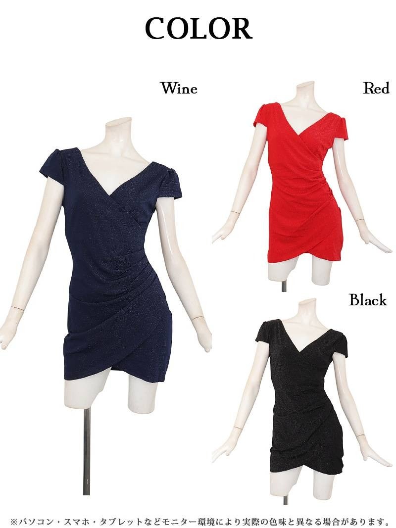 6. きらきらラメ入り素材のストレッチが効いたカシュクール風袖付きタイトミニドレス りせり 着用 キャバドレス【RyuyuChick】(S/M/L/XL(2L)/XXL(3L)/XXXL(4L))(ネイビー/レッド/ブラック)