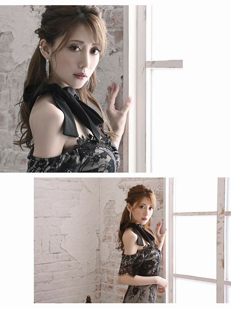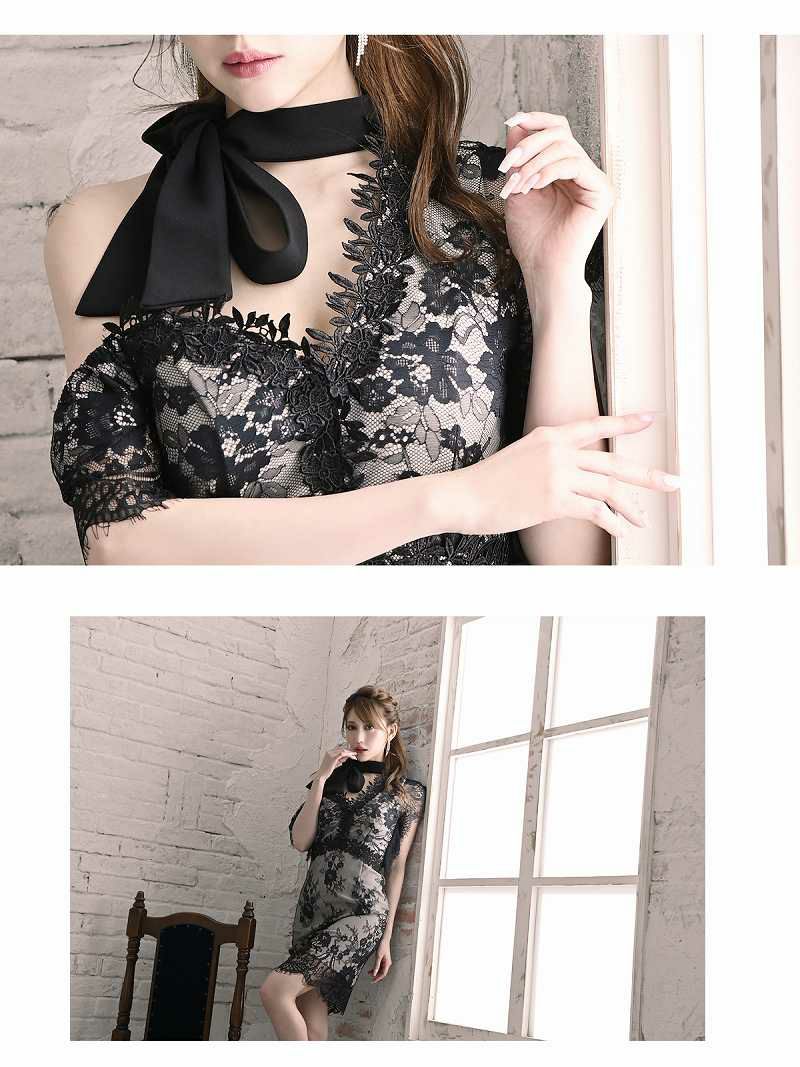 オープンショルダーレース中ミニミニドレス かとみか着用 キャバクラドレス 【Ryuyu】(S/M/L/XL(2L))(ブラック)