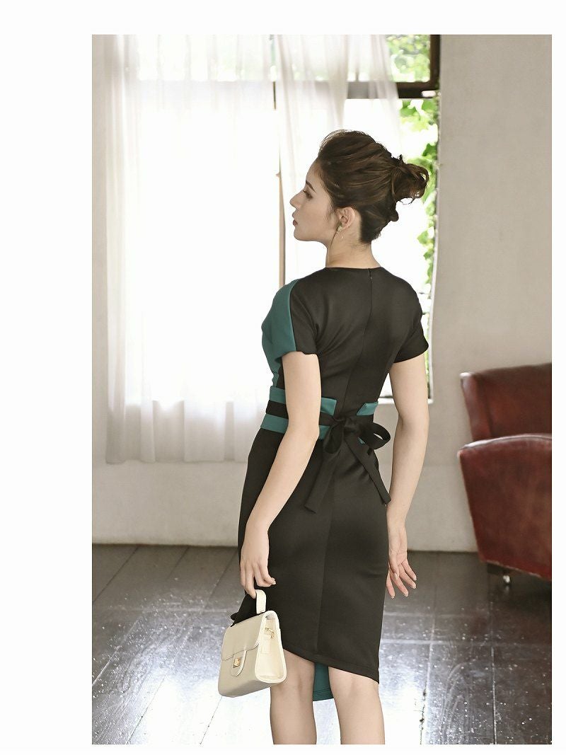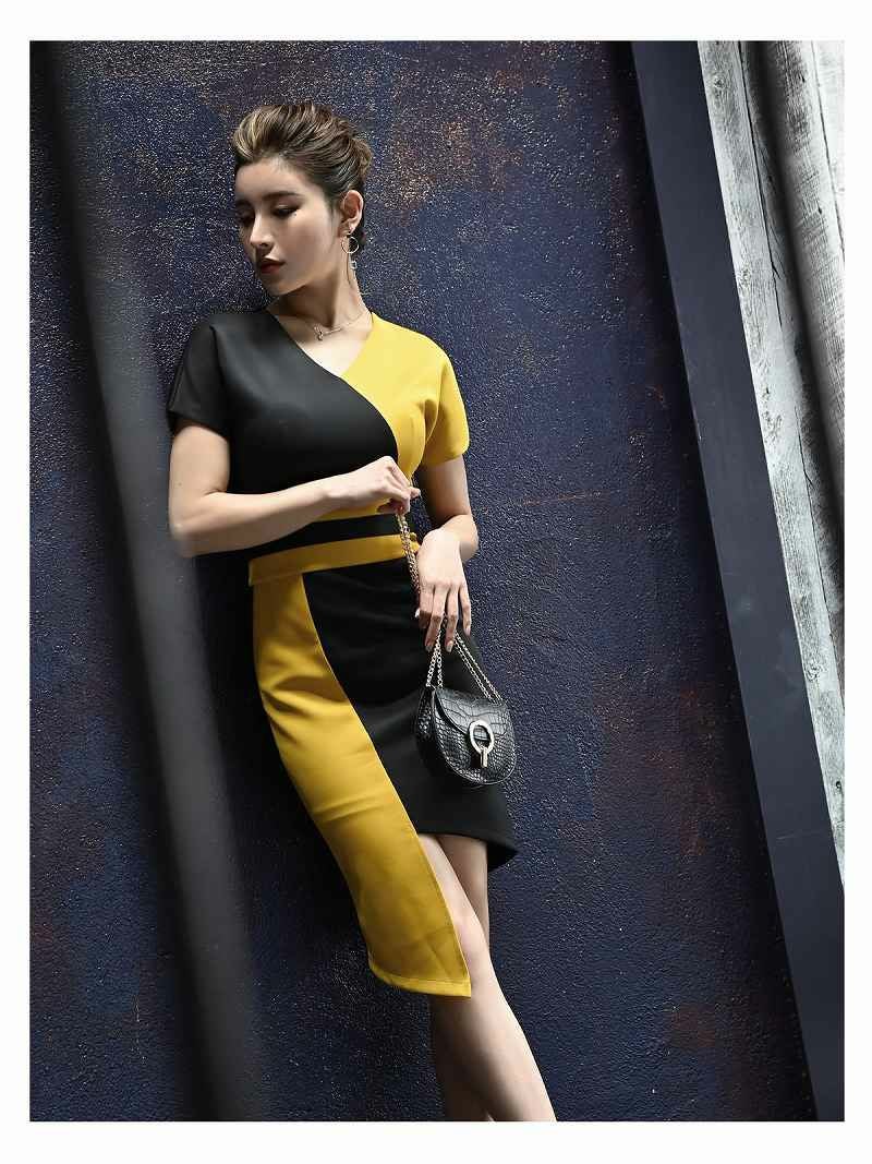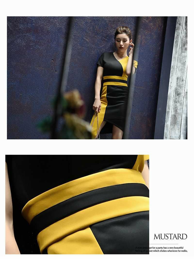 アシンメトリーデザインが個性を引き立てる韓国キャバワンピース。バイカラーのコントラストが目を引き、Vカットがデコルテを美しく見せます。