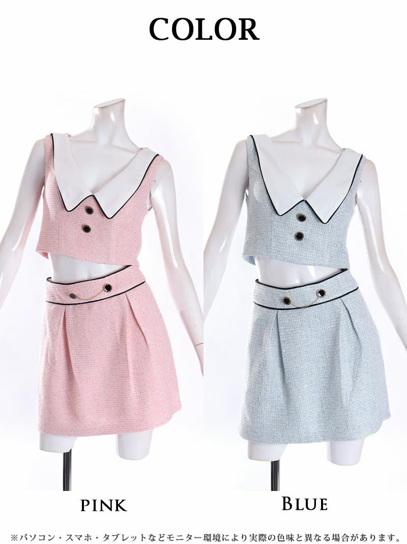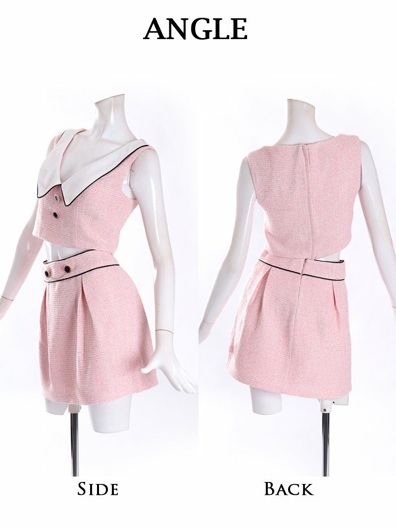 甘かわデザインが乙女心をくすぐる! 【PURESS/ピュアレス】パイピングツイードデザインセットアップキャバドレス セパレートドレス(XS/S/M)(ピンク/ブルー)