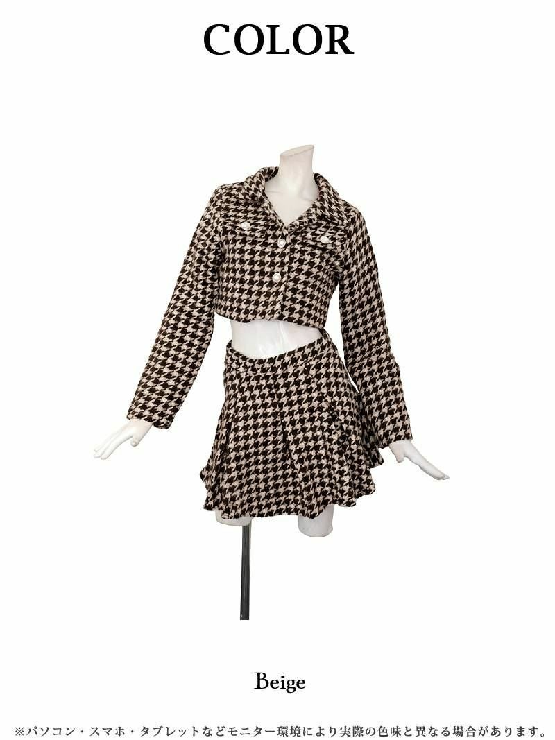 6. クラシカルな千鳥柄にパールボタンが映える厚手ツイードの韓国風セットアップスーツ 【Ryuyu】(S/M)(ベージュ)