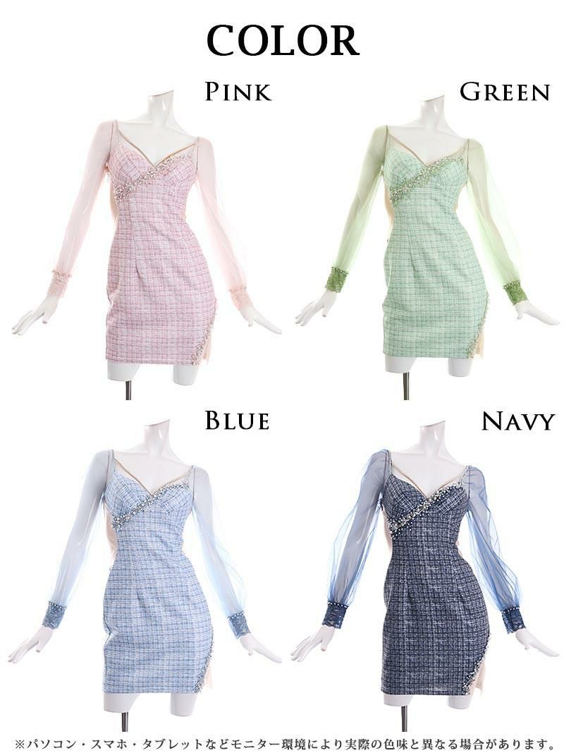 4. 【Angel R/エンジェルアール】袖付きチェック柄ツイードキャバミニドレス(S/M)(ピンク/ブルー/ネイビー/グリーン)