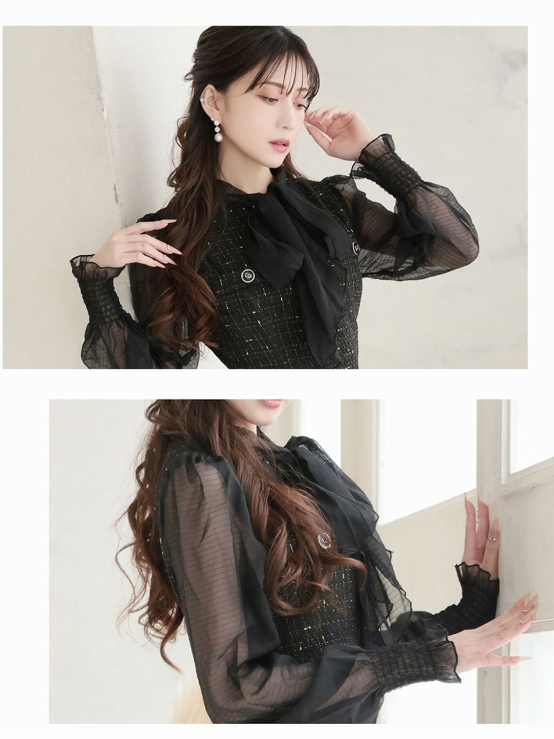 シアー袖とツイードの異素材ミックスで魅せる、上品リッチな大人の膝丈タイトドレス! 先行予約割¥7980→¥7581!※一部予約販売※ボウタイリボンが目を惹くツイードシフォン袖付き膝丈タイトキャバワンピース 加賀美早紀 着用ワンピース【Belsia】(S/M/L/XL(2L))(ブラック) ptpl