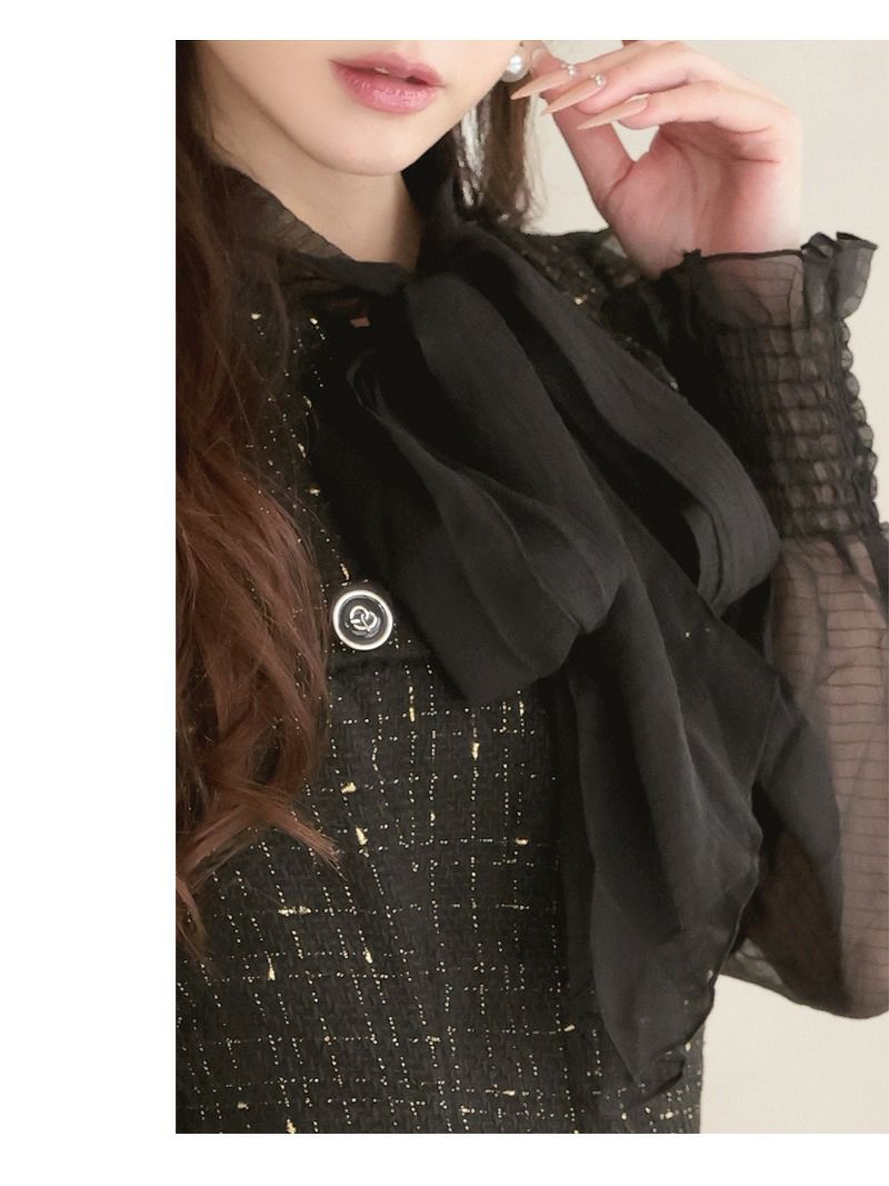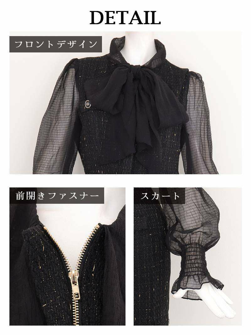 6. 先行予約割¥7980→¥7581!※一部予約販売※ボウタイリボンが目を惹くツイードシフォン袖付き膝丈タイトキャバワンピース 加賀美早紀 着用ワンピース【Belsia】(S/M/L/XL(2L))(ブラック) ptpl