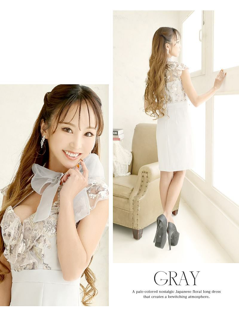 キャバ可愛い花刺繍ドレス リボンシアーキャバドレス 武田静加 着用キャバクラドレス 花刺繍バストカットミニドレス【Belsia】(XS/S/M/L/XL)(グレー)
