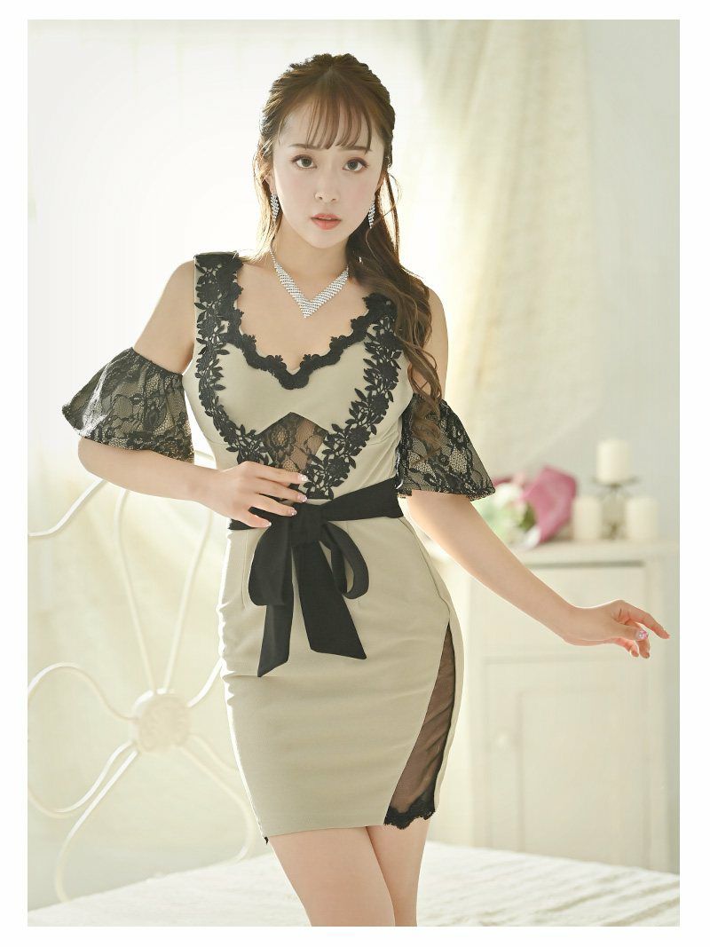 5. スーパーセール¥6980→¥6282! ウエスト透け袖ありオープンショルダーキャバドレス みりちゃむ 着用ミニドレス【Ryuyu】(S/M/L)(ブラック/グレージュ)