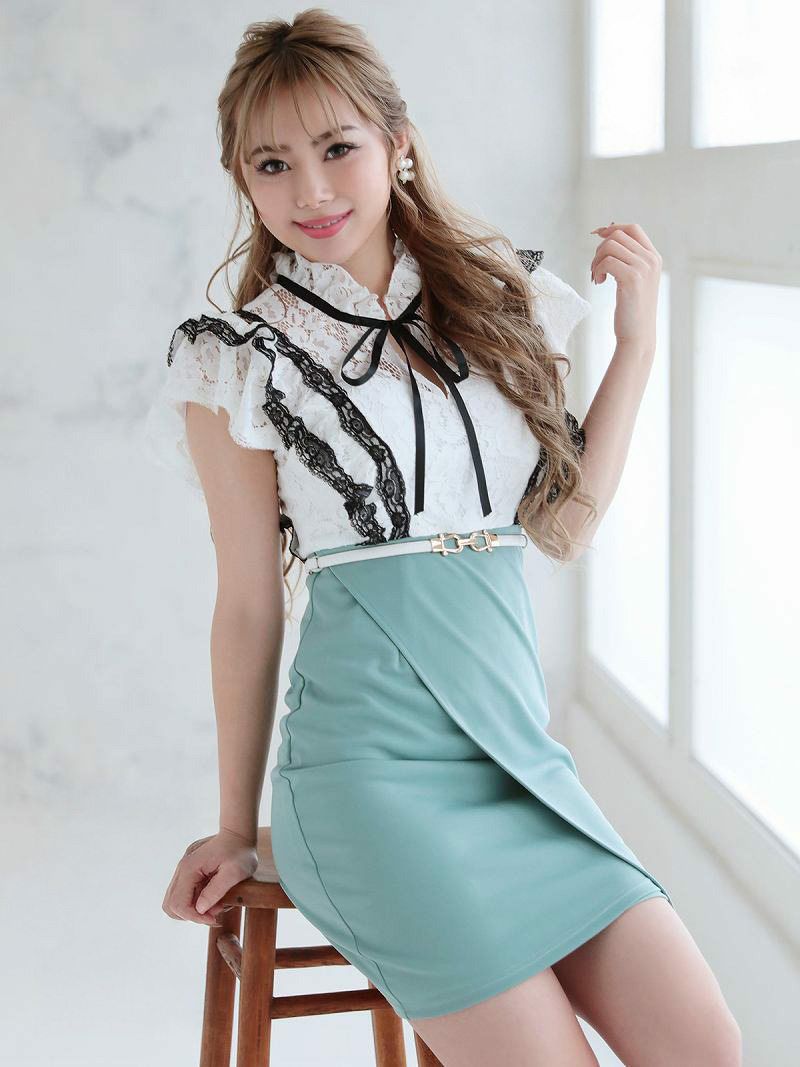 7. ホワイトレース×ペールカラー袖ありバイカラーキャバクラドレス MIYU 着用キャバドレス【Ryuyu】(S/M/L)(ブルー/ミント/ダスティーピンク)