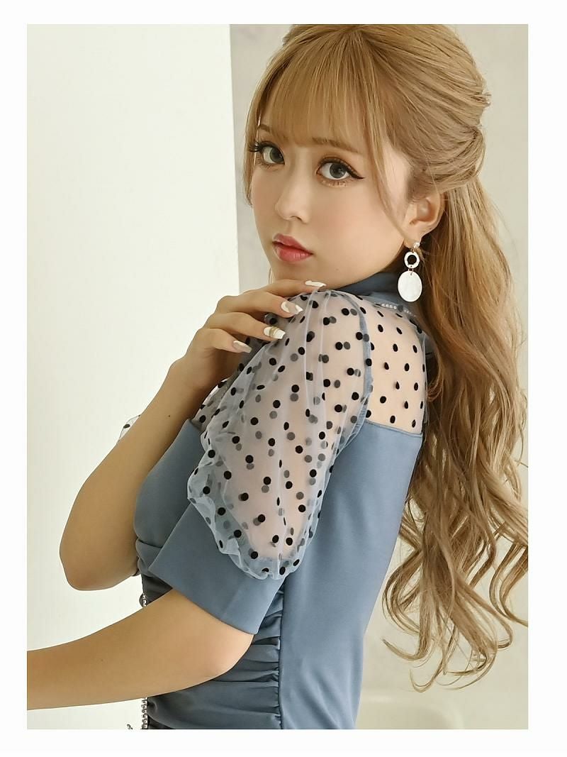 シアーな袖に水玉デザインを施し、フェミニンさと大人のエレガンスを絶妙にミックス。デコルテ部分はクロスデザインで、上品さとセクシーさを引き立てます♪