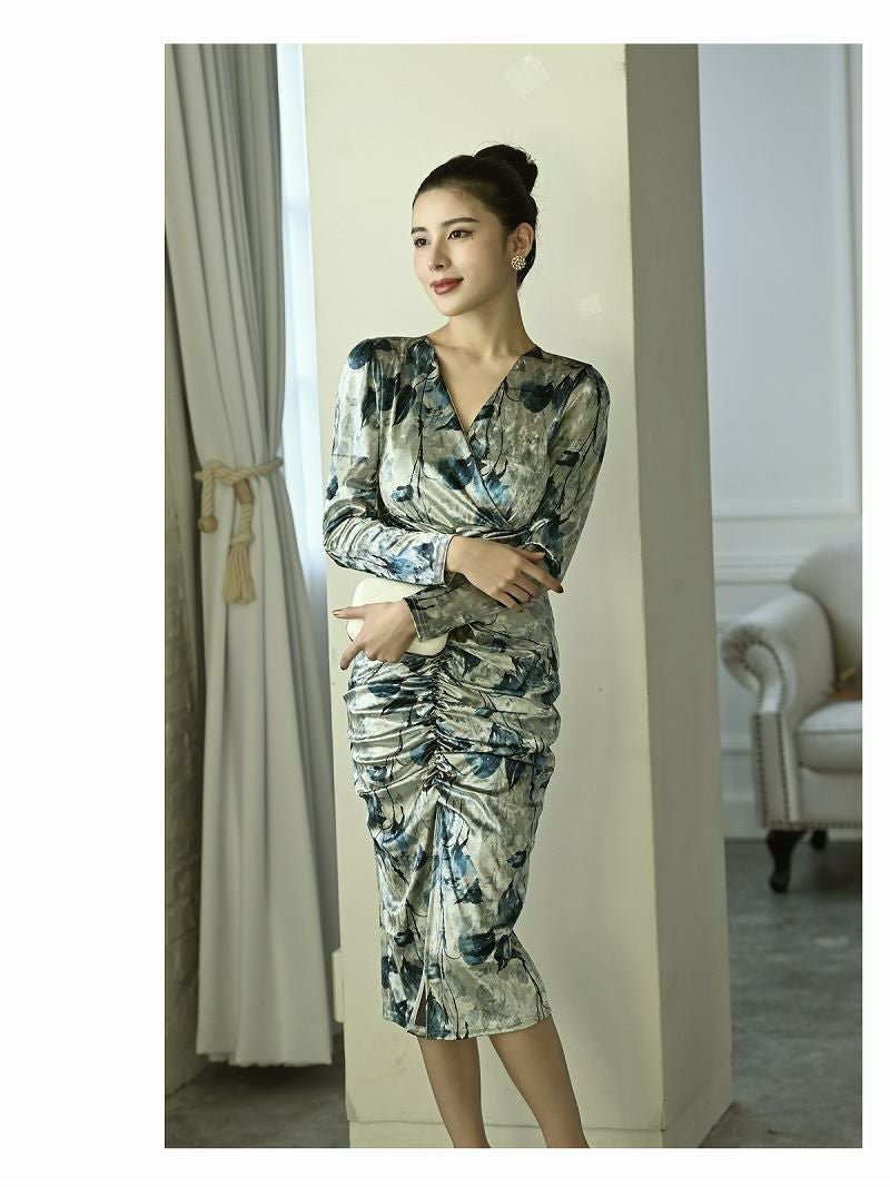 エレガントなビロード素材を使用した韓国キャバドレス。タイトなシルエットとシャーリングデザインで女性らしさを引き立てます。