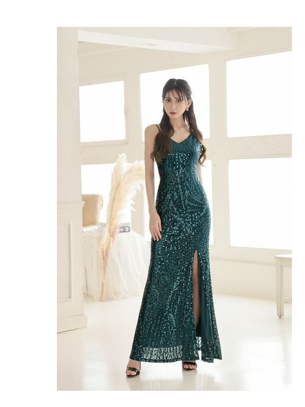 総スパンコール深スリットVネックマーメイドロングドレス 加賀美早紀 着用キャバドレス【Belsia】