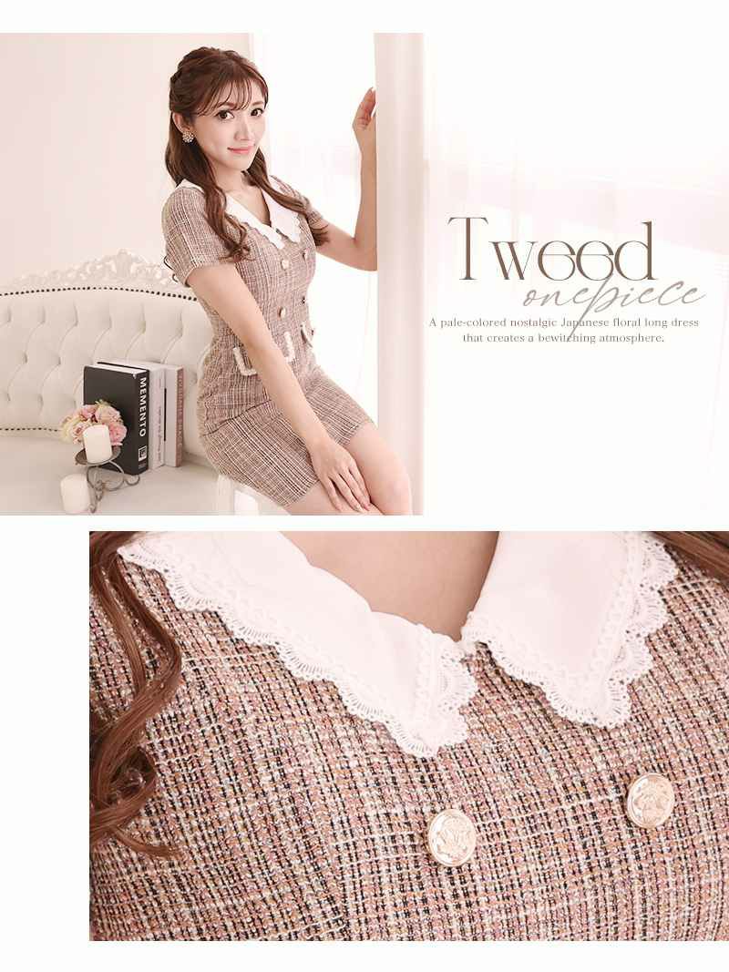 4. ゾロ目SALE¥6980→¥4444! 半袖ツイードフリル襟韓国風ワンピース【Ryuyu】(S/M/L)(ブラウン/ピンク)