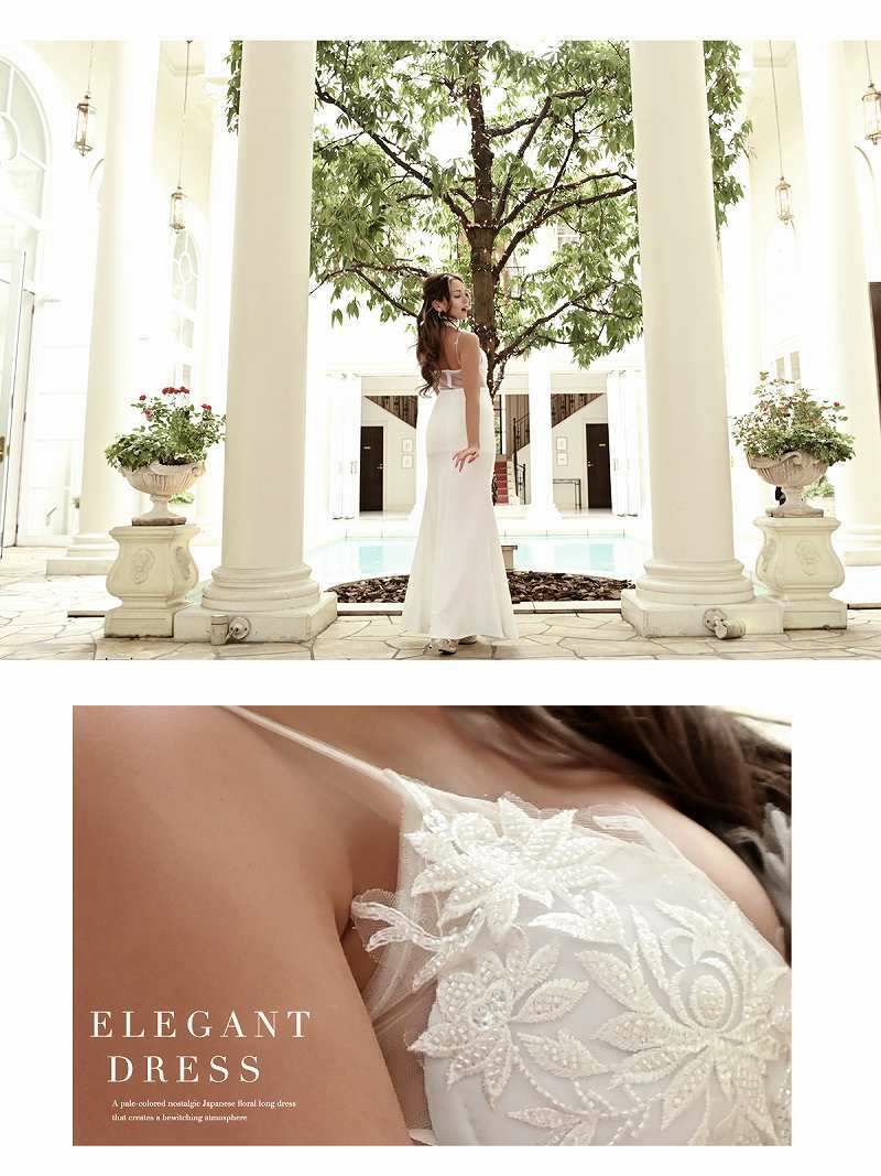 大胆に上半身がシースルー素材となっておりバストから背中まで360度セクシーさもあり上品さも兼ね備えたホワイトドレスです。