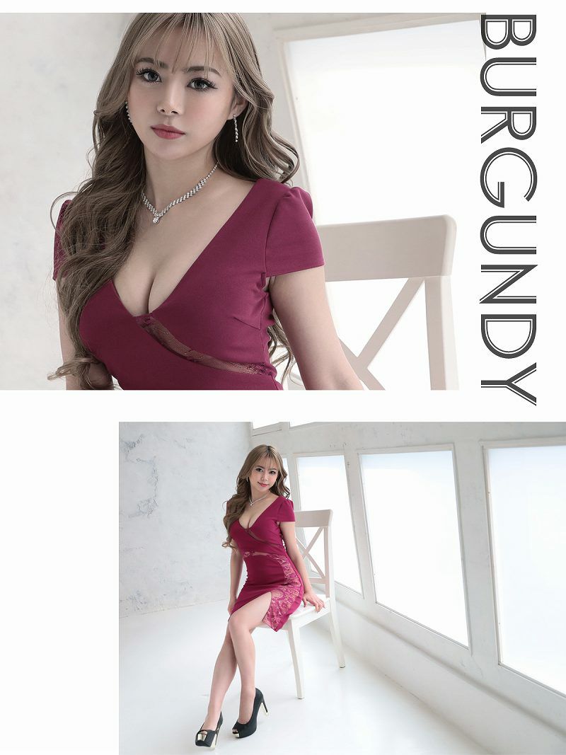 春色バイカラーで清楚さUP キャバドレスレースパフスリーブキャバクラドレス【RyuyuChick】(S/M/L)(ミント/ワイン/ピンク/ネイビー)