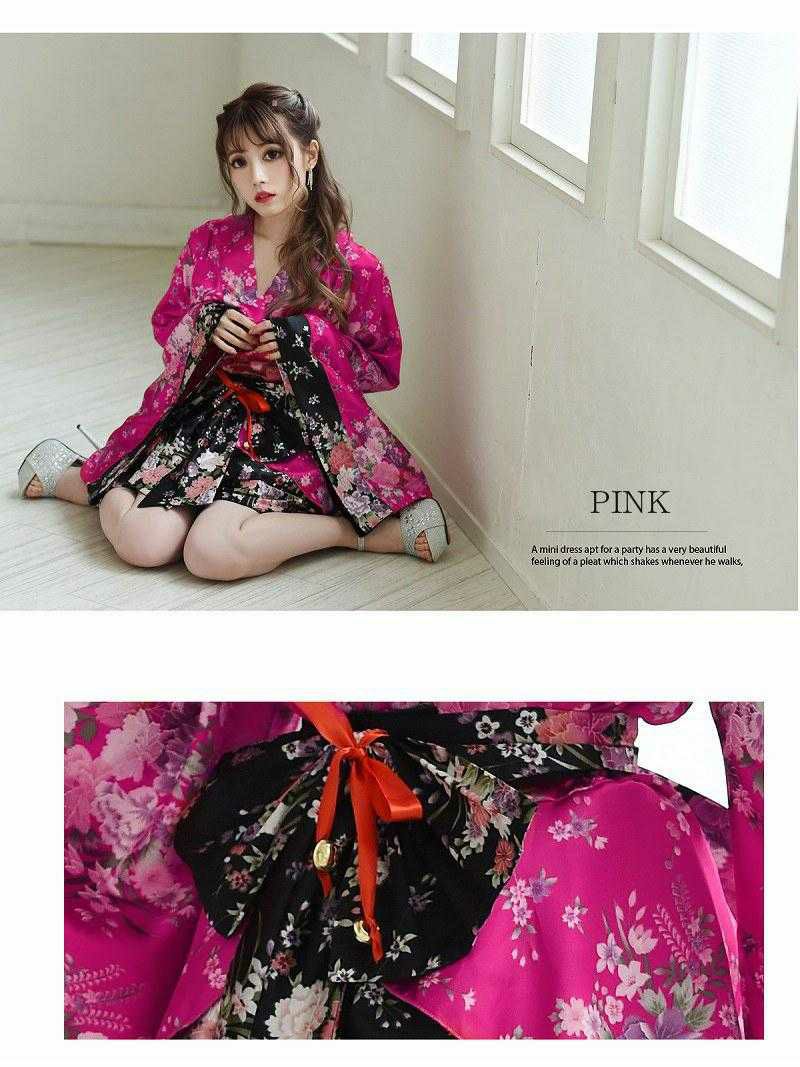 一般的な着物のようなデザインの和柄ドレス、前ミニタイプの和柄ドレス、ミニマムさんに特におすすめのミニスカートタイプの和柄ドレス。
