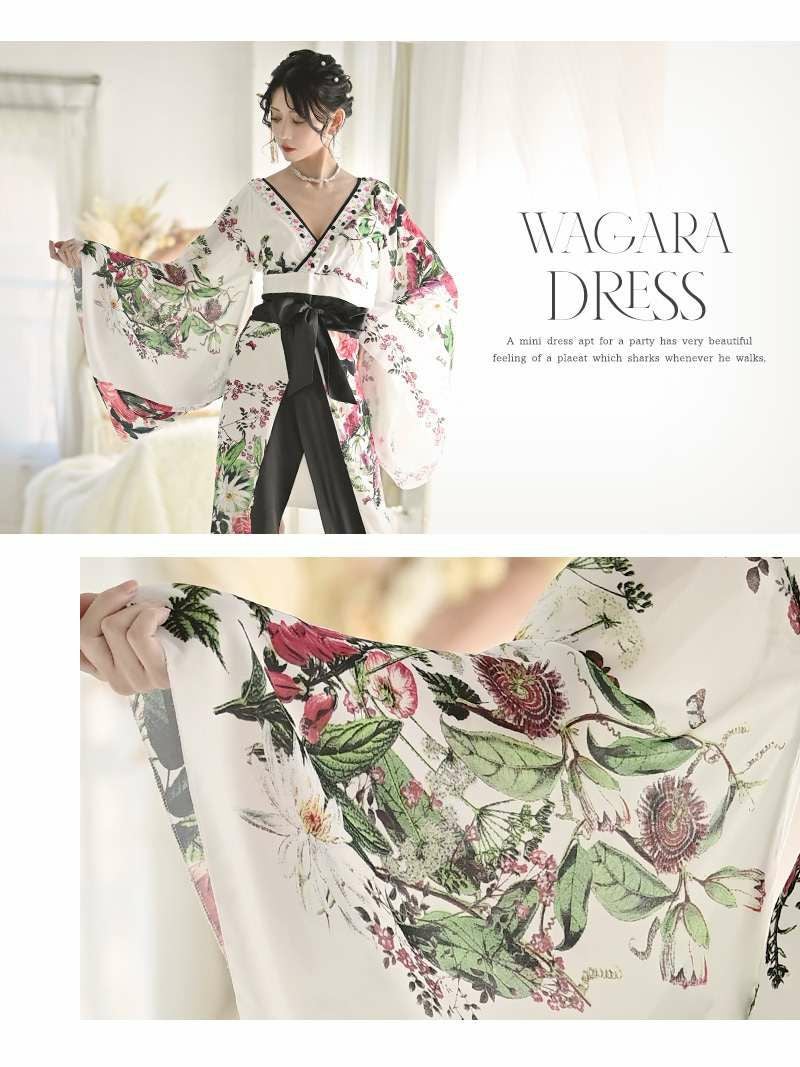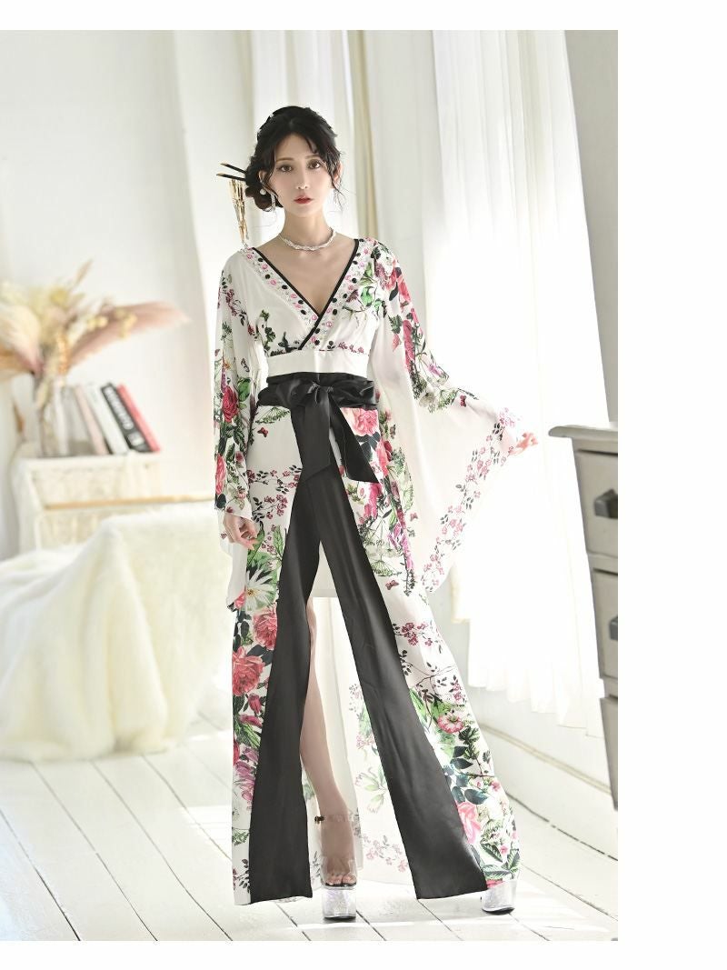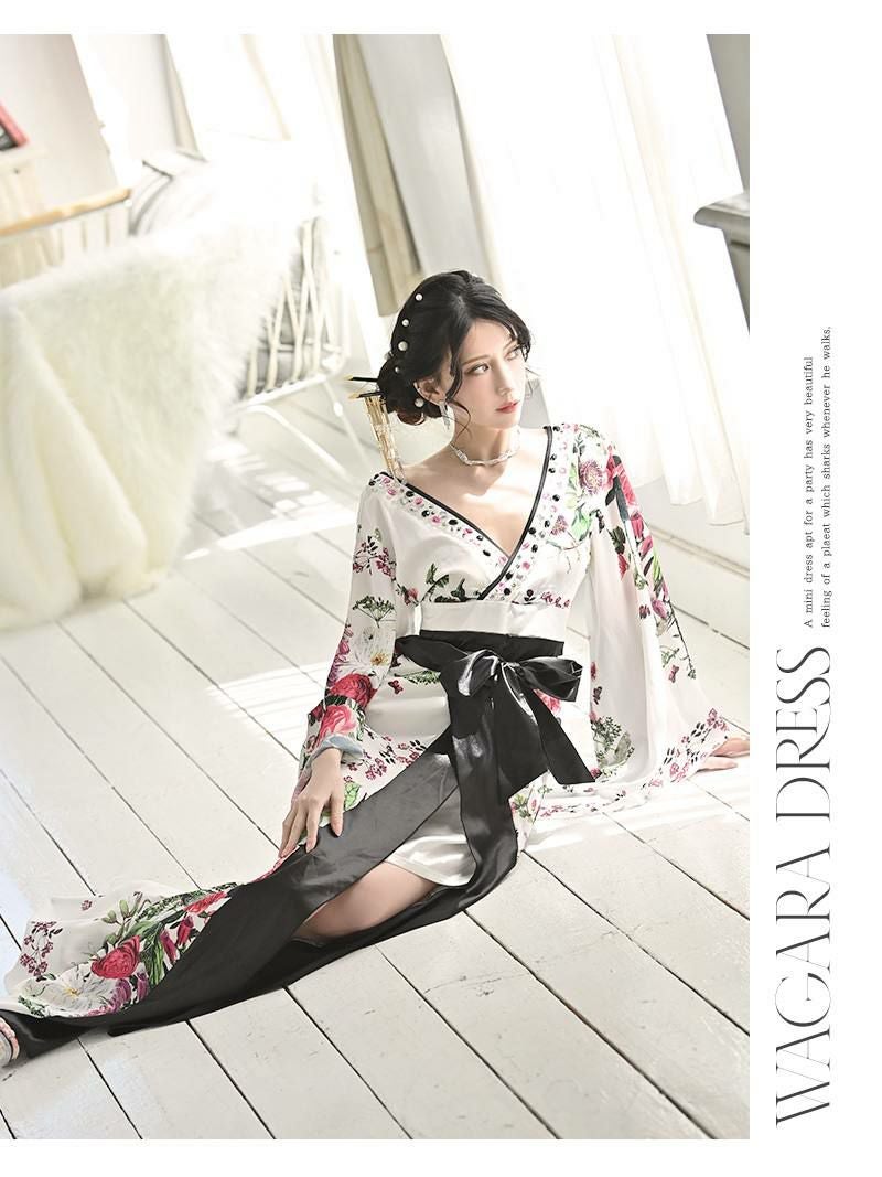 清楚な純白に可憐な花柄をあしらった和柄ドレス。軽やかなシフォン素材が優雅に揺れ、ロング丈と大胆なスリットがセクシーな雰囲気を演出。