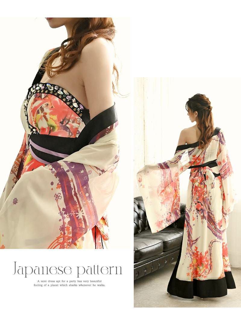 4. 【訳ありアウトレット】妖艶ホワイト華やか花魁風の和柄ドレス【流遊】(S/M/L/XL)(オフホワイト)