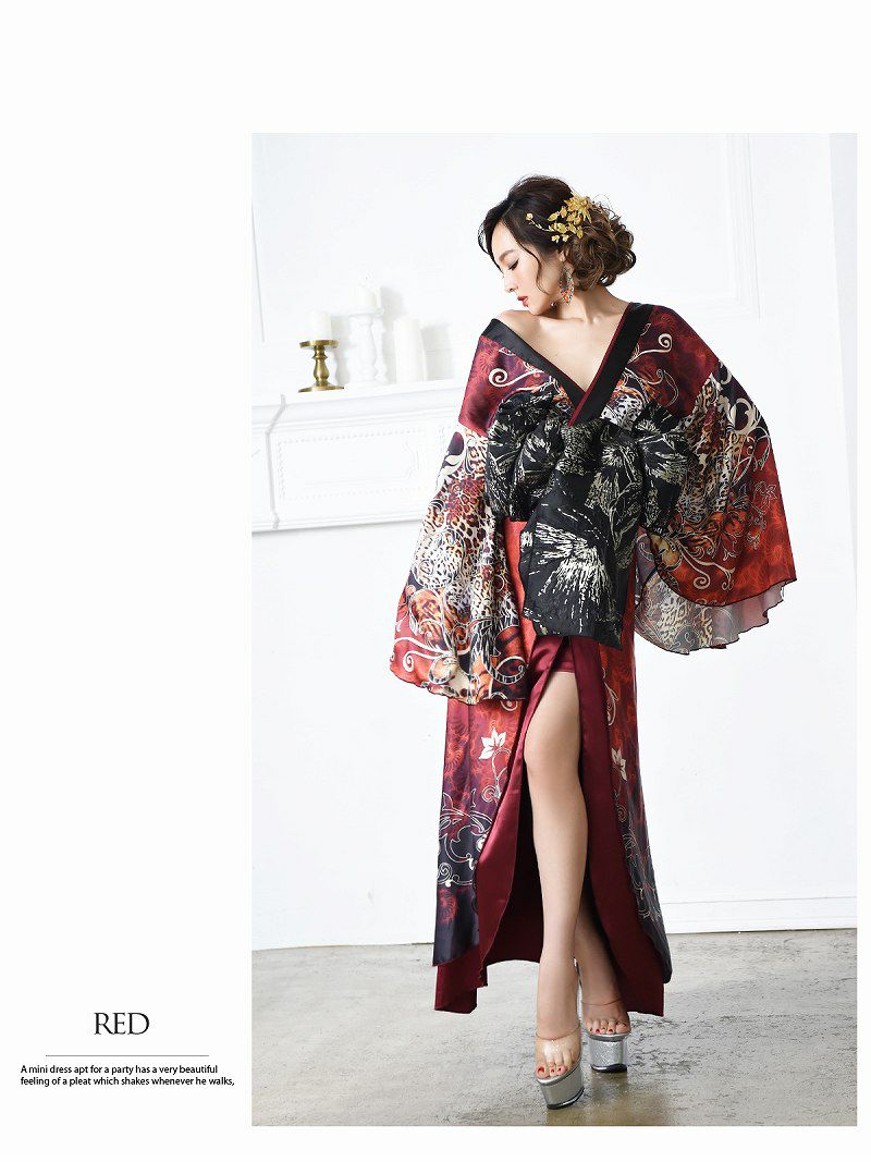 ヒョウ柄と和柄が絶妙に融合した、ゴージャスでセクシーな花魁ドレス。深みのある赤が華やかさを引き立て、ロング丈の着物ドレスが優雅なシルエットを演出。存在感抜群のデザインで、特別な夜を彩ります。