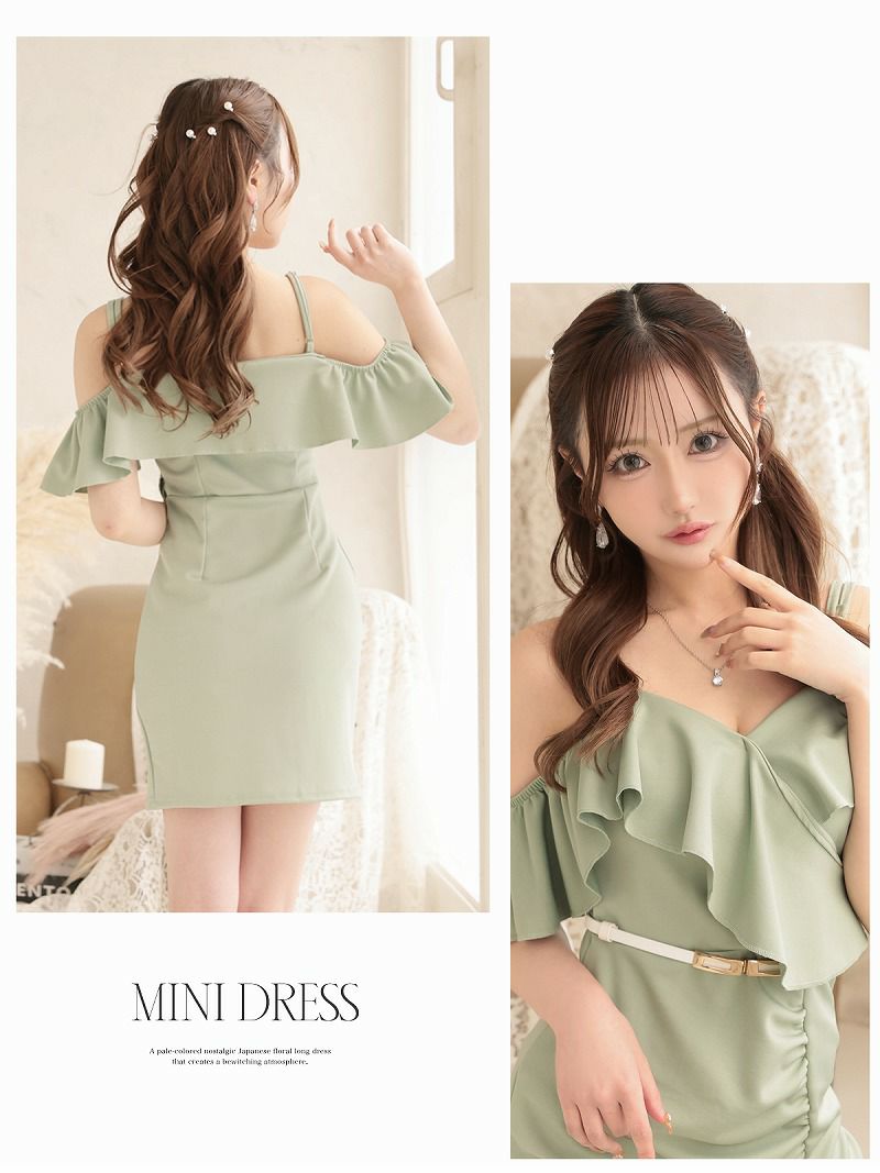 揺れる大ぶりフリルとタイトなシルエットで周囲の視線を釘付けにするミニドレス。 先行予約割¥3980→¥3781!※一部予約販売※オフショルフリルタイトミニドレス りせり 着用 キャバドレス【RyuyuChick】(S/M/L/XL(2L))(ブラック/レッド/ライトグリーン)