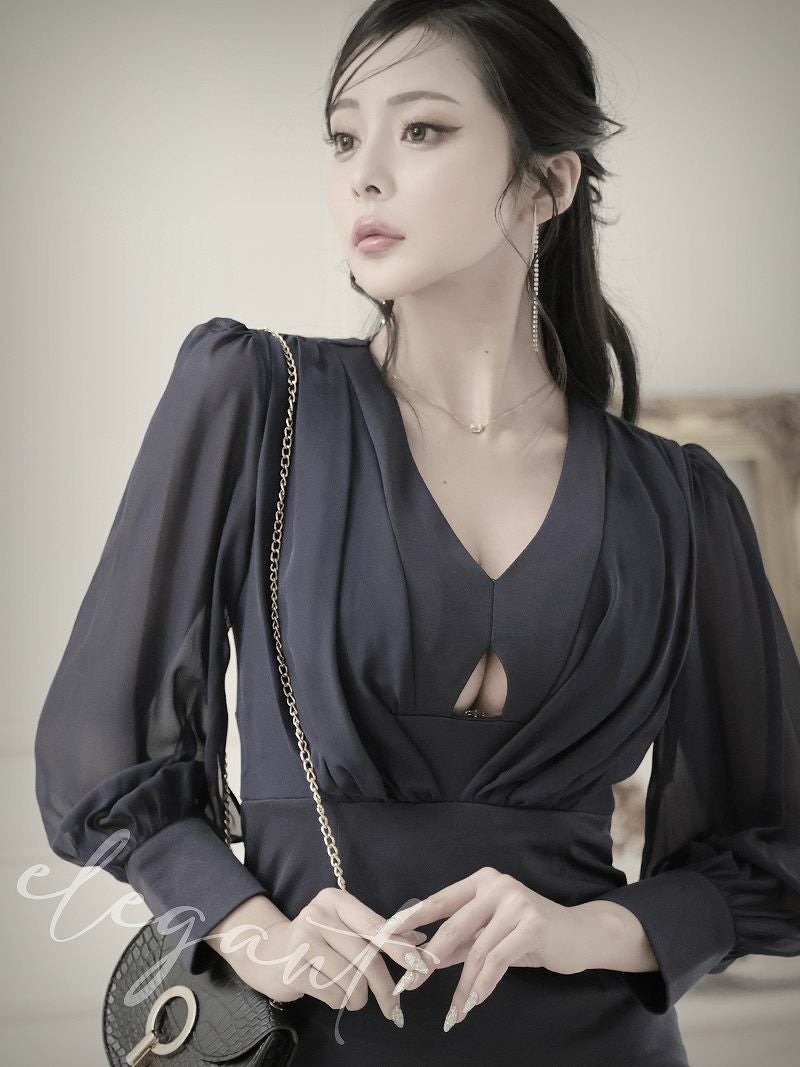 リゾートセレブコーデ! バックシャン韓国風セットアップ【DAYS PIECE】キャバワンピ(M)(ネイビー/ブラック)