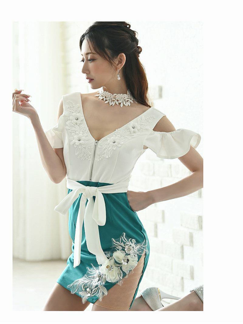 珍しい花柄デザインで華やかさプラス 袖付き谷間見せ立体フラワーキャバドレス まぁみ ゆずは 着用ミニドレス【Ryuyu】(S/M/L)(ピンク/ホワイト/グレー)