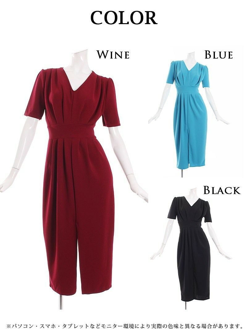 カラーはワイン ブラック ブルーの3色展開、3色とも魅力的なカラーですが今季トレンドカラーであるブルーは着るだけで一気に垢抜けるのでおすすめのワンカラードレスです。