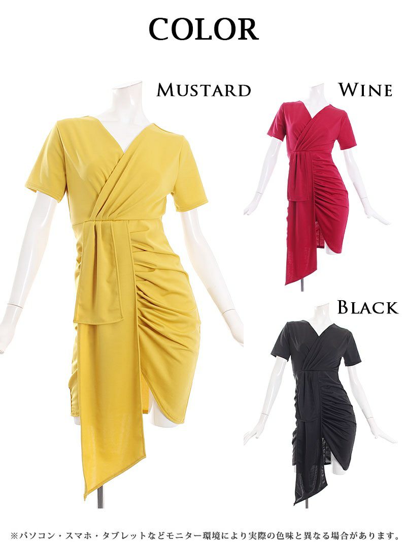 体型カバー効果抜群のシンプルきれいめワンピ サイドギャザー半袖膝丈ワンピース【RyuyuChick】(S/M/L)(マスタード/ワイン/ブラック)
