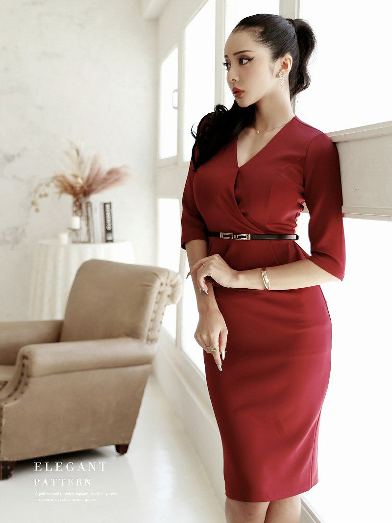 5. スーパーセール¥8380→¥7542! 膝丈大人lady袖ありキャバワンピース KANO 着用 韓国ドレス【DAYS PIECE】(S/M/L/XL)(ワイン/グリーン/ネイビー)