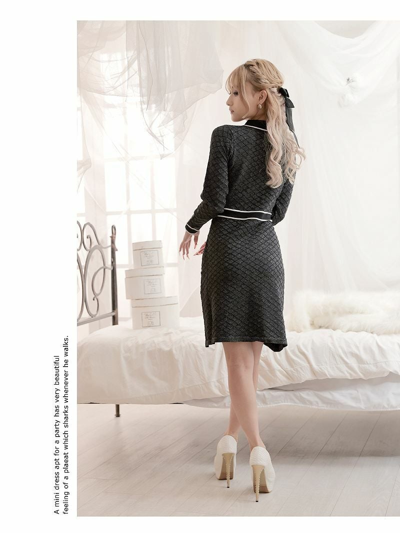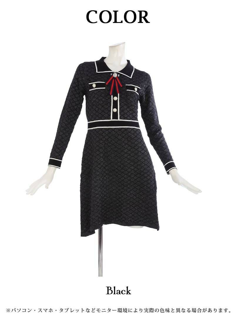 6. ニットツイードリボンブローチ長袖キャバワンピース あいみん 着用 韓国風ワンピース【RyuyuChick】(M)(ブラック)