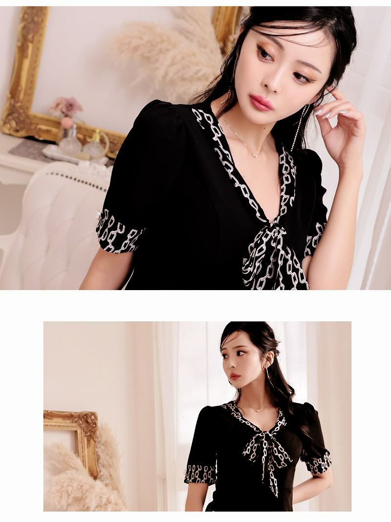 大人柄が女性らしい魅力を惹きだす セレブ柄リボンミディ丈韓国風ワンピース KANO 着用 ラウンジワンピース【DAYS PIECE】(S/M/L)(ブラック/ホワイト) ptpl