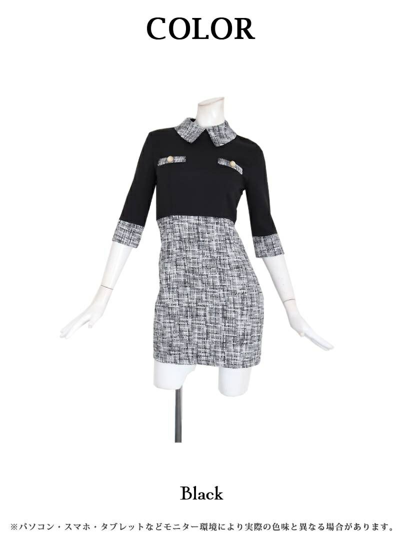 4. 襟付きバイカラーツイード袖付きキャバワンピース 武田静加 着用 ラウンジワンピース【Belsia】(S/M/L)(ブラック) ptpl