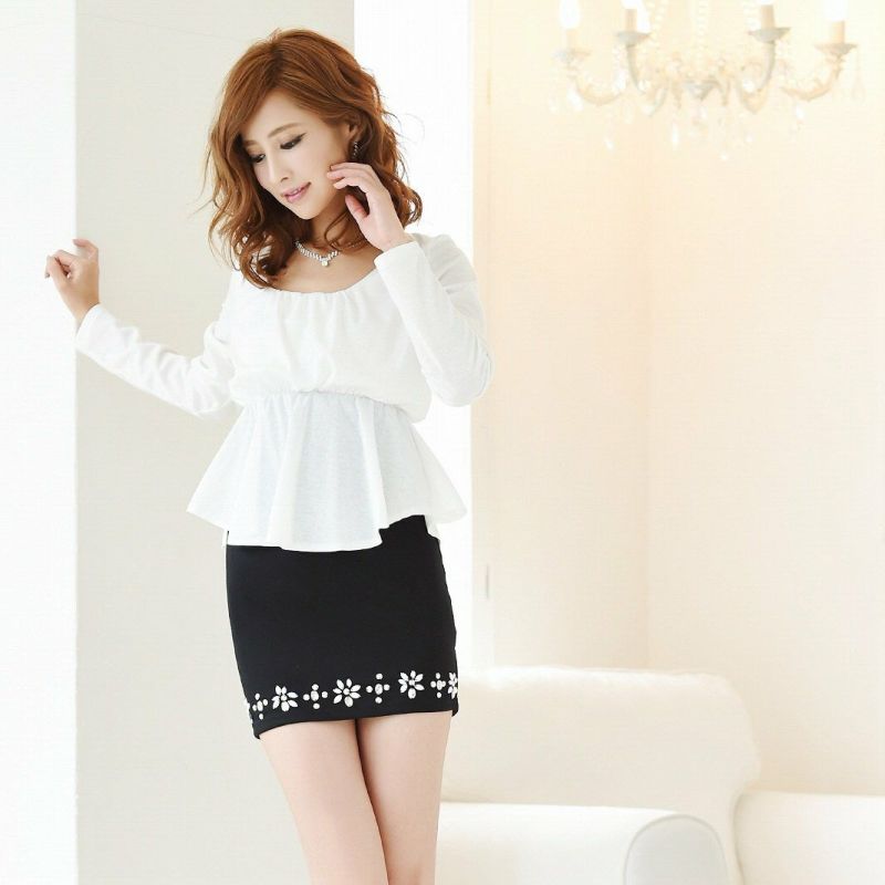 5. 【訳ありアウトレット】長袖ペプラムcuteキャバクラミニワンピ【RyuyuChick】(S/M/L/XL/XXL)(ブラック/ホワイト)