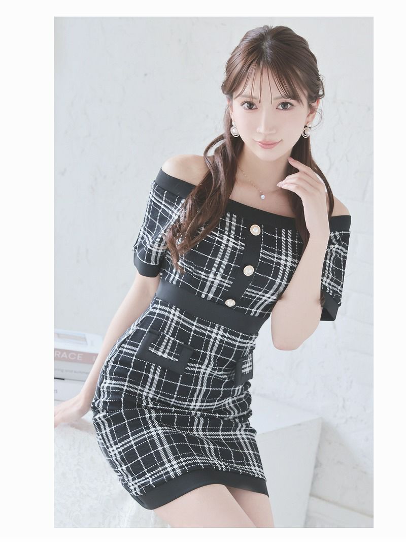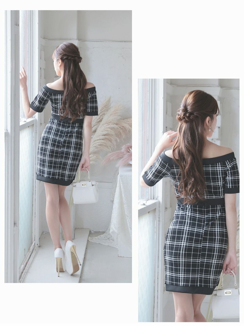 大人ドール風チェック柄オフショルタイトキャバ嬢ミニドレス【Ryuyu】