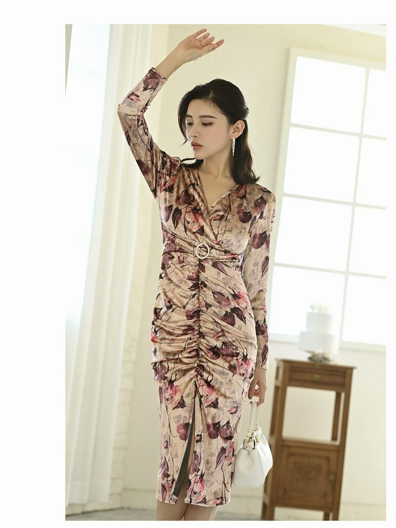 エレガントなビロード素材を使用した韓国キャバドレス。タイトなシルエットとシャーリングデザインで女性らしさを引き立てます。