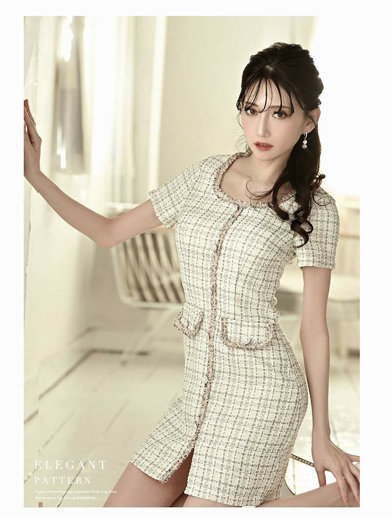 ラメが煌めくツイード生地で、豪華で華やかな印象を与えるミニ丈キャバワンピース。