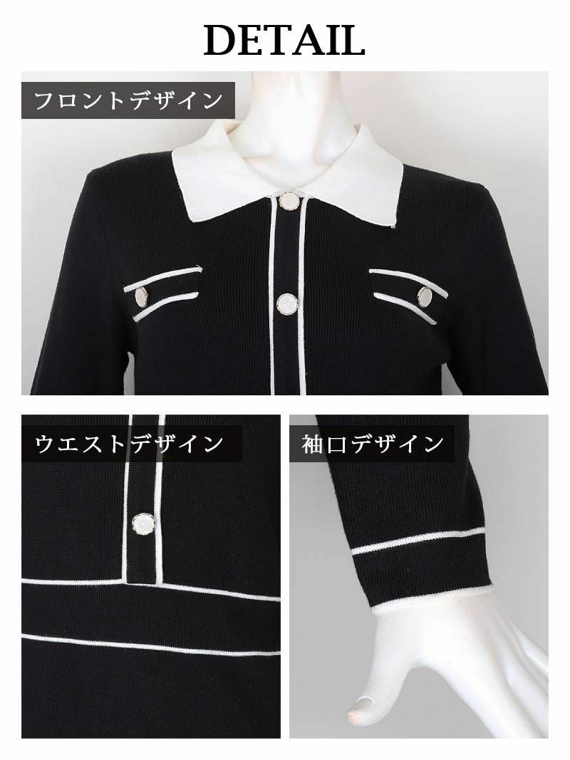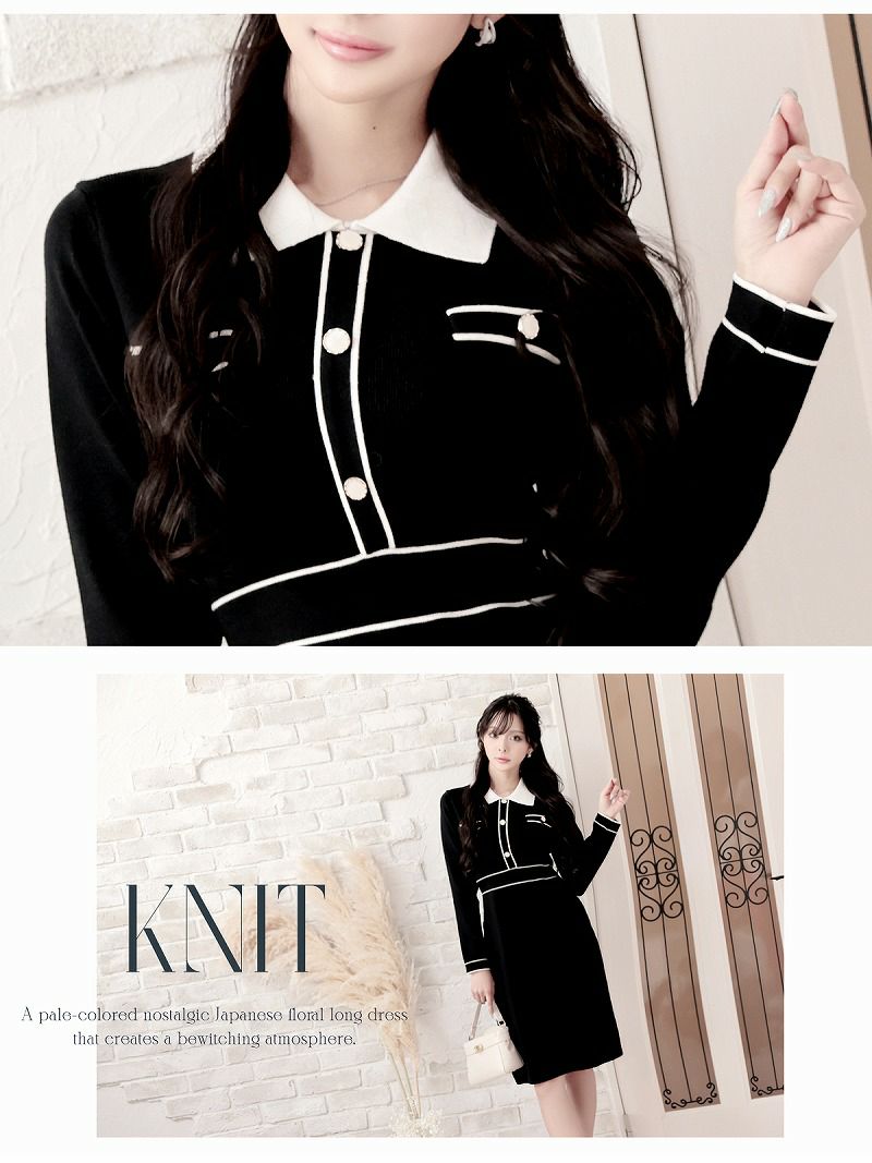 洗練された美オーラ纏う モノトーン襟付き長袖ニットタイトキャバワンピース KANO 着用 韓国ワンピース【DaysPiece】(M/L)(ブラック)