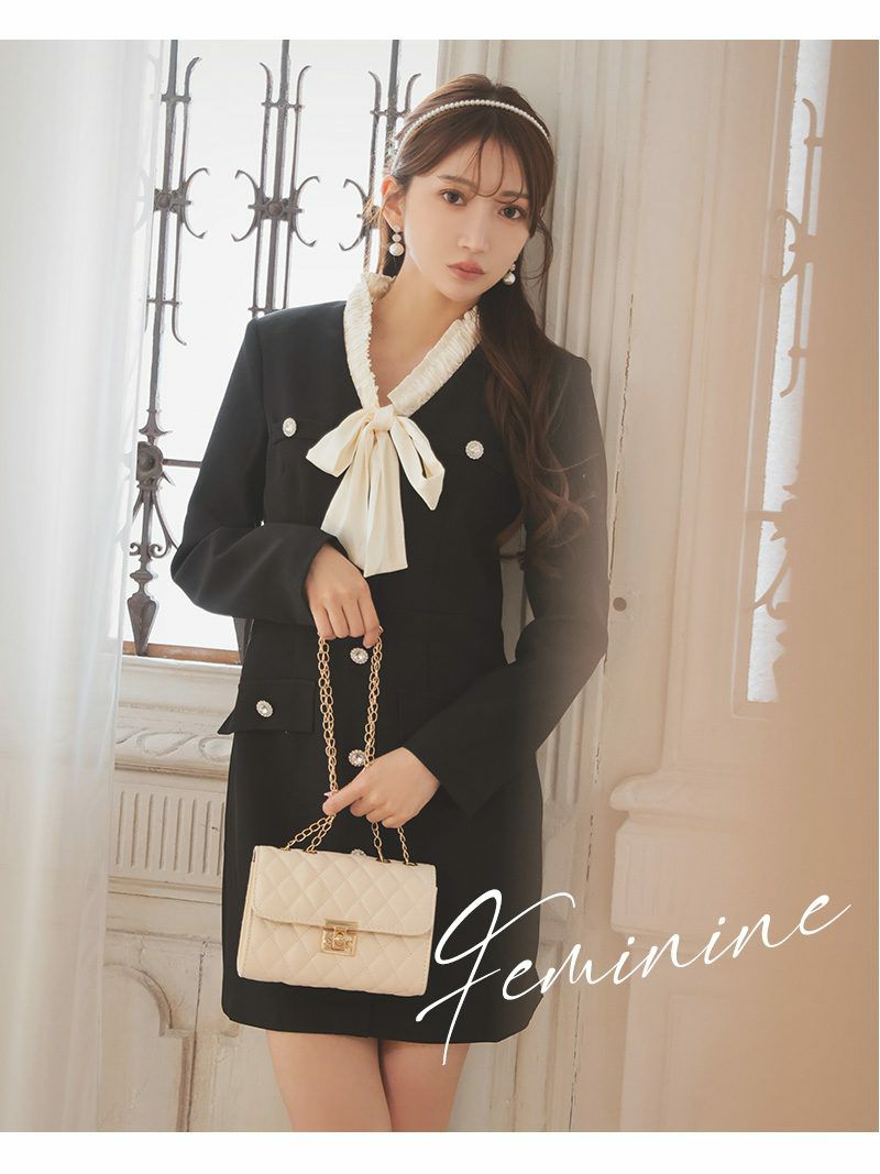 取り外し可能なホワイトのボウタイが、顔周りを華やかに演出し一気にレディな雰囲気に格上げします!
