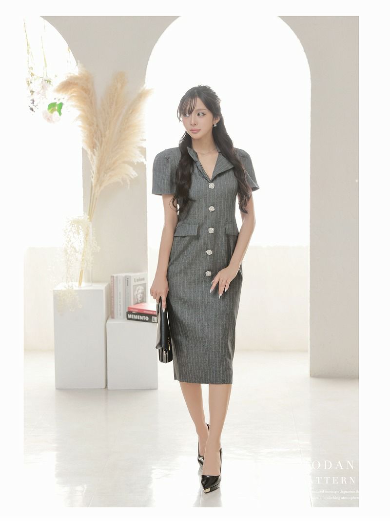4. ストライプタイト襟付き膝丈韓国ワンピース KANO 着用 キャバワンピース【DAYS PIECE】(S/M/L/XL(2L)/XXL(3L))(グレー)