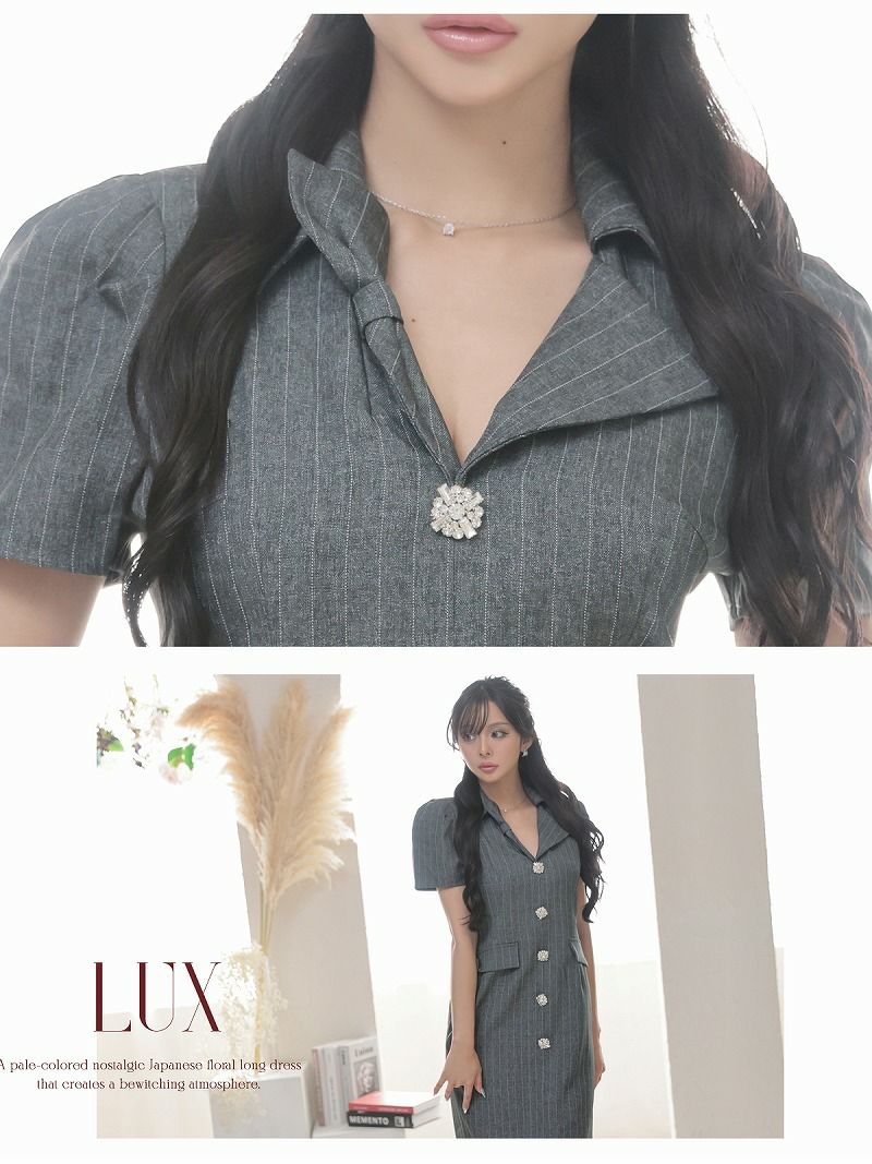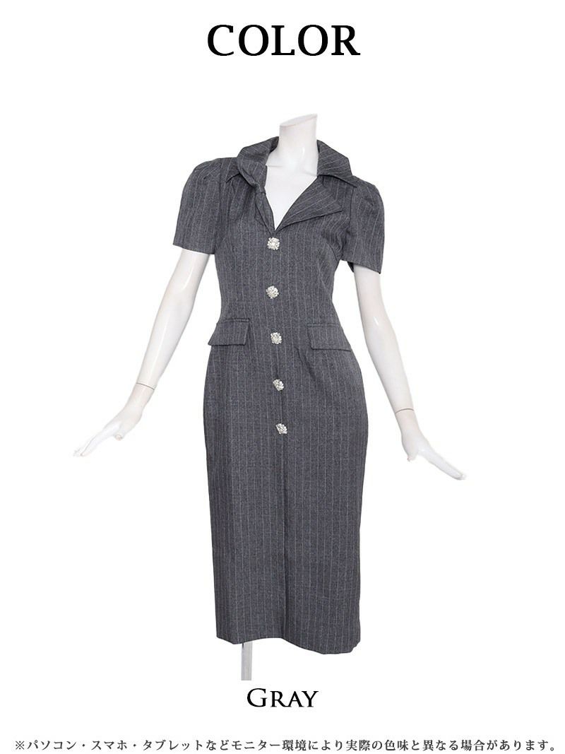 かっこいいのにかわいい、ドレッシーな韓国キャバワンピース。 ストライプタイト襟付き膝丈韓国ワンピース KANO 着用 キャバワンピース【DAYS PIECE】(S/M/L/XL(2L)/XXL(3L))(グレー)