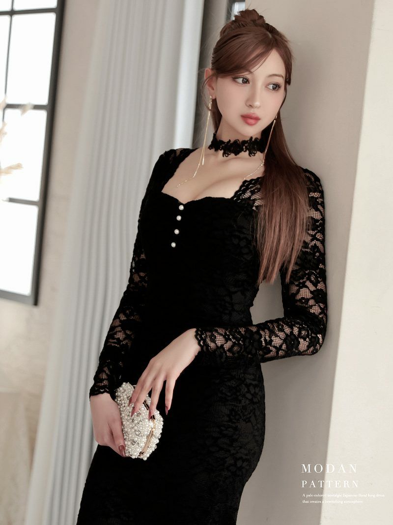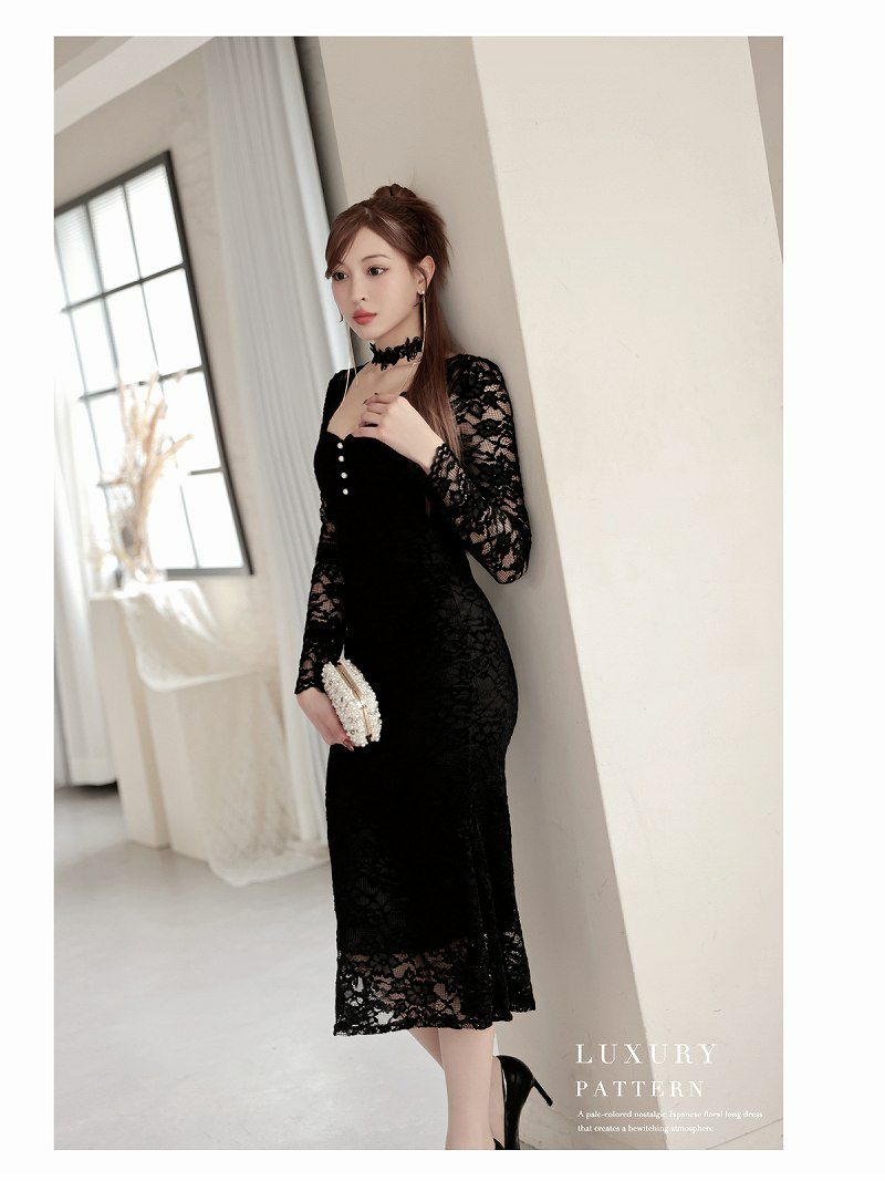 ※予約販売※総レースシースルー長袖チョーカー付き韓国風ロングワンピース パールボタン KANO 着用 キャバワンピース【DaysPiece】