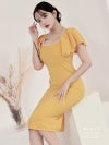 7. 二の腕を可愛くカバーするダブルフリル袖とパールビジューが大人な韓国風タイトワンピース 【DaysPiece】(S/M/L/XL(2L))(ブラック/イエロー)