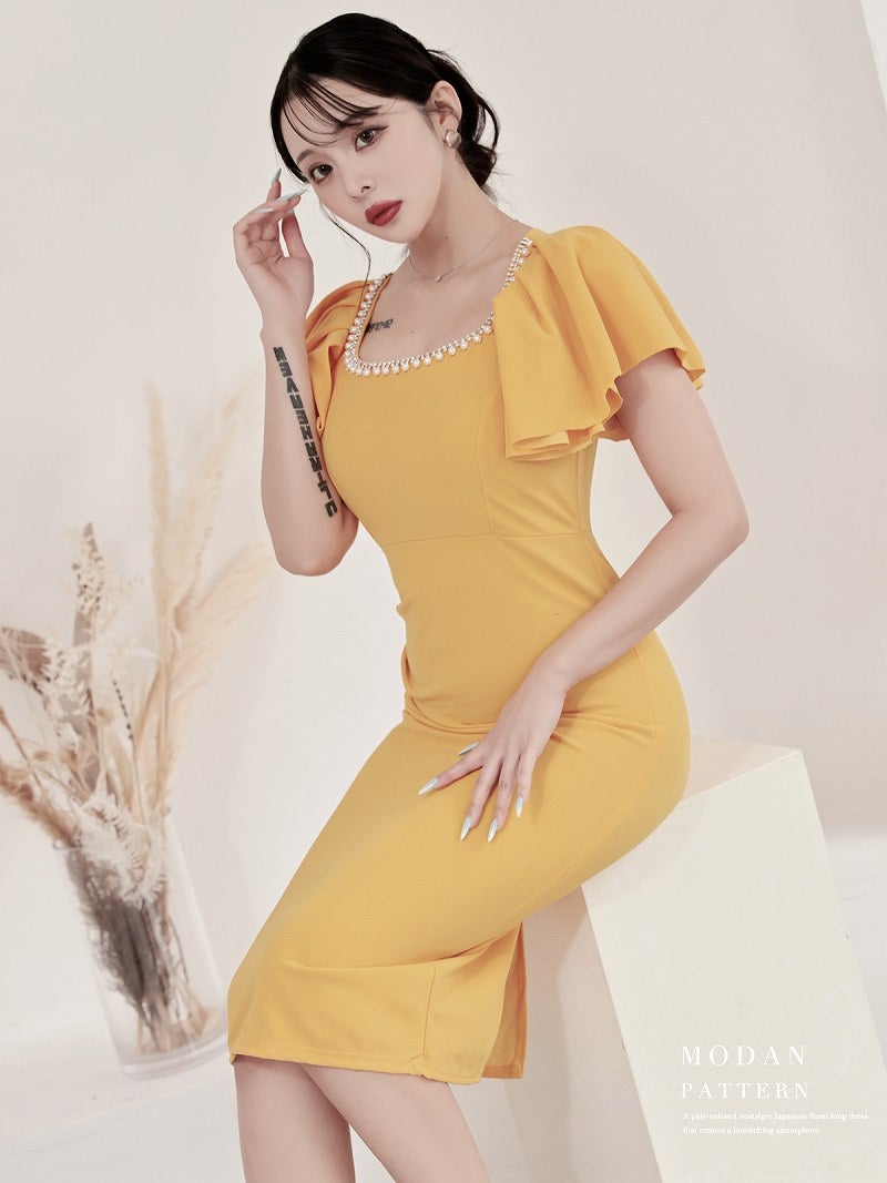5. 二の腕を可愛くカバーするダブルフリル袖とパールビジューが大人な韓国風タイトワンピース 【DaysPiece】(S/M/L/XL(2L))(ブラック/イエロー)