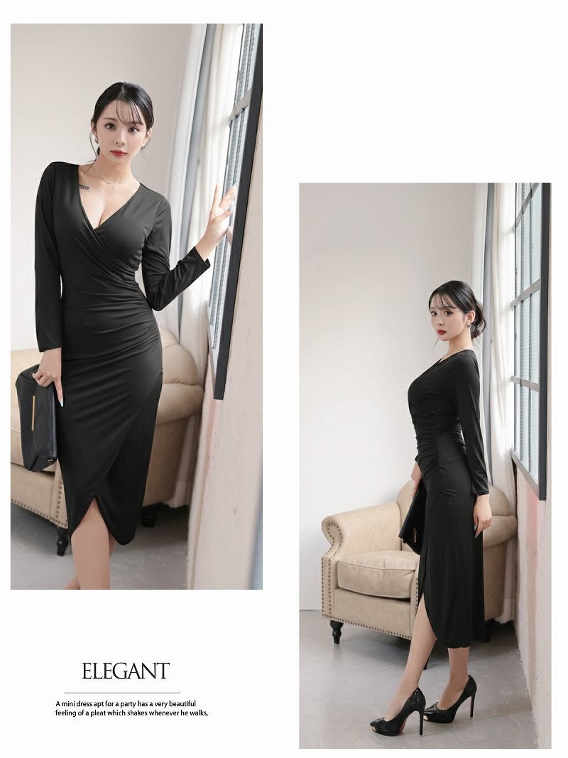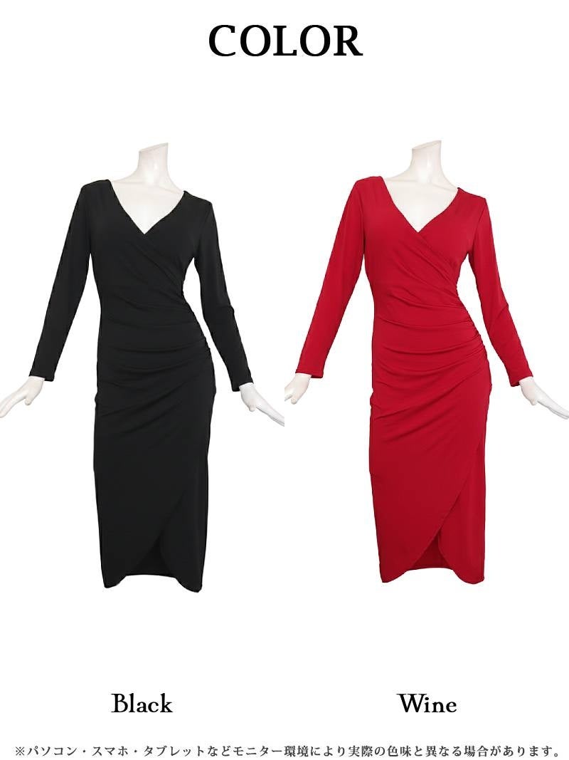 大胆な背中みせとサイドギャザーの魔法で洗練されたシルエットを手に入れる。 ※一部予約販売※背中みせデザインで色気を放つ韓国風長袖ワンピース KANO 着用 キャバワンピース【DaysPiece】(S/M/L/XL(2L))(ワイン/ブラック)
